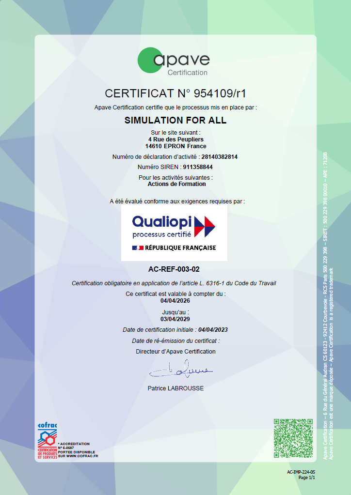 Simulation For All est certifié depuis le 04/04/2023 – certificat n°954109 – pour la catégorie « Actions de formation ».